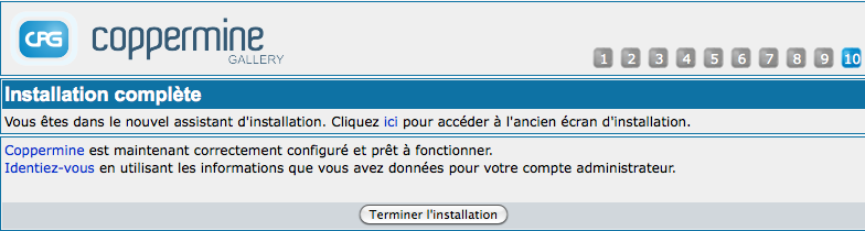 L'écran de structure de la base de données n'est là que pour votre information - vous ne pourrez agir sur rien ici. L'écran montre la progression des opérations réalisées pour créer les tables de la base de données de votre galerie. Si tout se passe bien, vous verrez une série de lignes avec des messages du type Création de la table 'XXX' Statut:... CORRECT. Si vous n'avez pas le statut "CORRECT" à chaque ligne, quelque chose ne s'est pas bien passé et il faudra vérifier. C'est généralement le cas si le compte de la base de données MySQL que vous avez défini à l'étape "Authentification de l'utilisateur MySQL" n'a pas les privilèges nécessaires à la création de tables. Une autre raison d'erreur peut provenir d'un manque de place dans la base de données. Dans les deux cas, vous devrez contacter votre hébergeur pour avoir de l'aide.